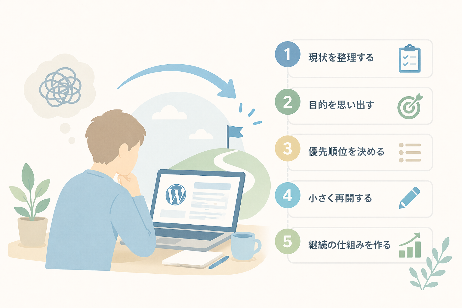 もし今、「そもそもサイト全体が止まっている」と感じるなら、 挫折したサイトを再開するときの順番 から戻るほうが自然です。